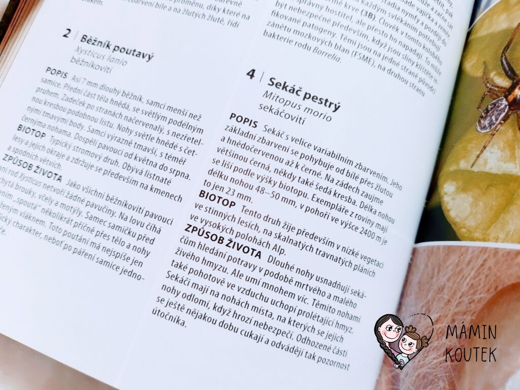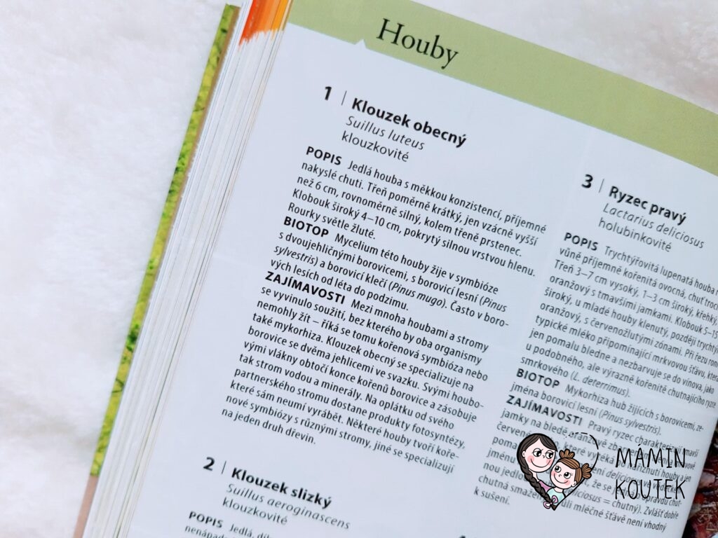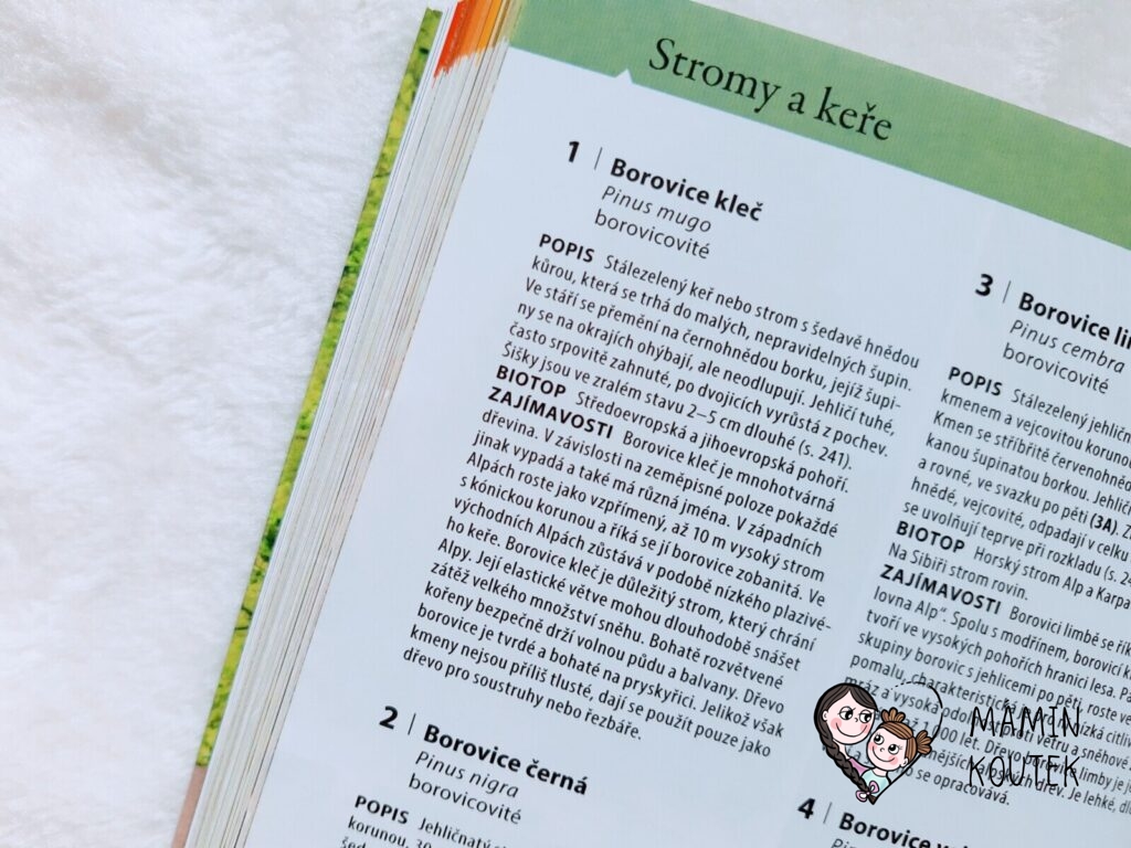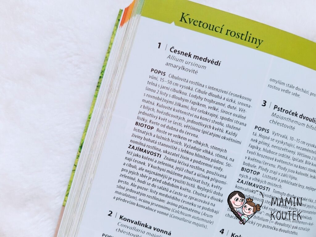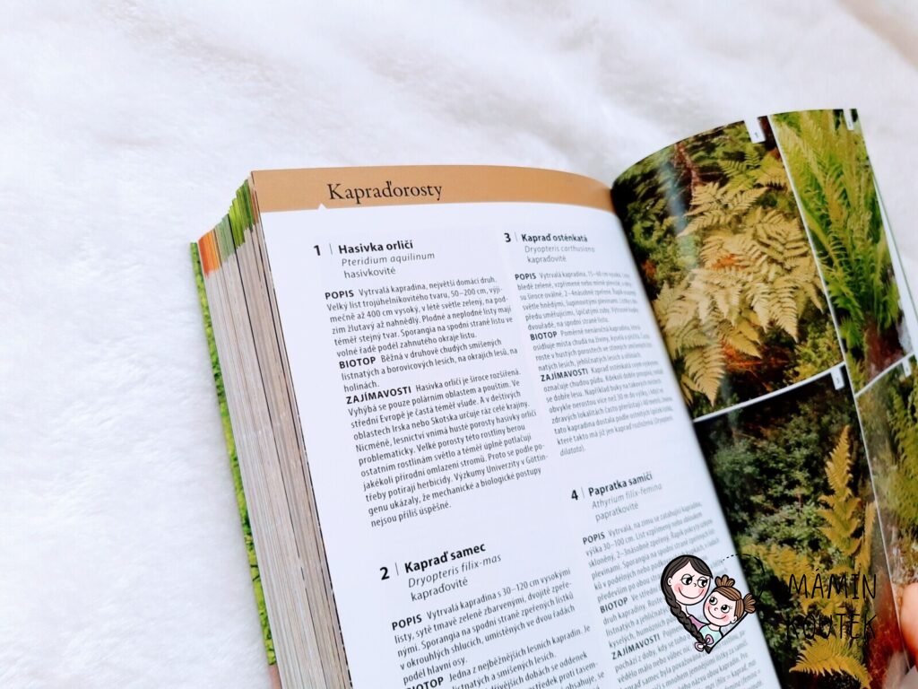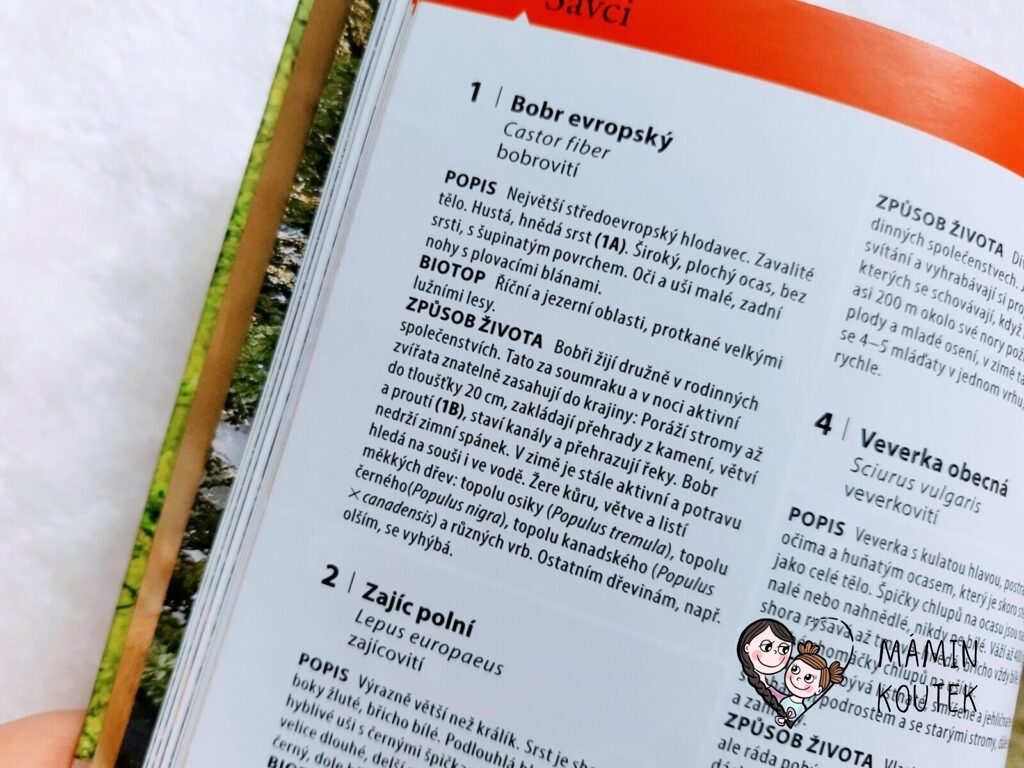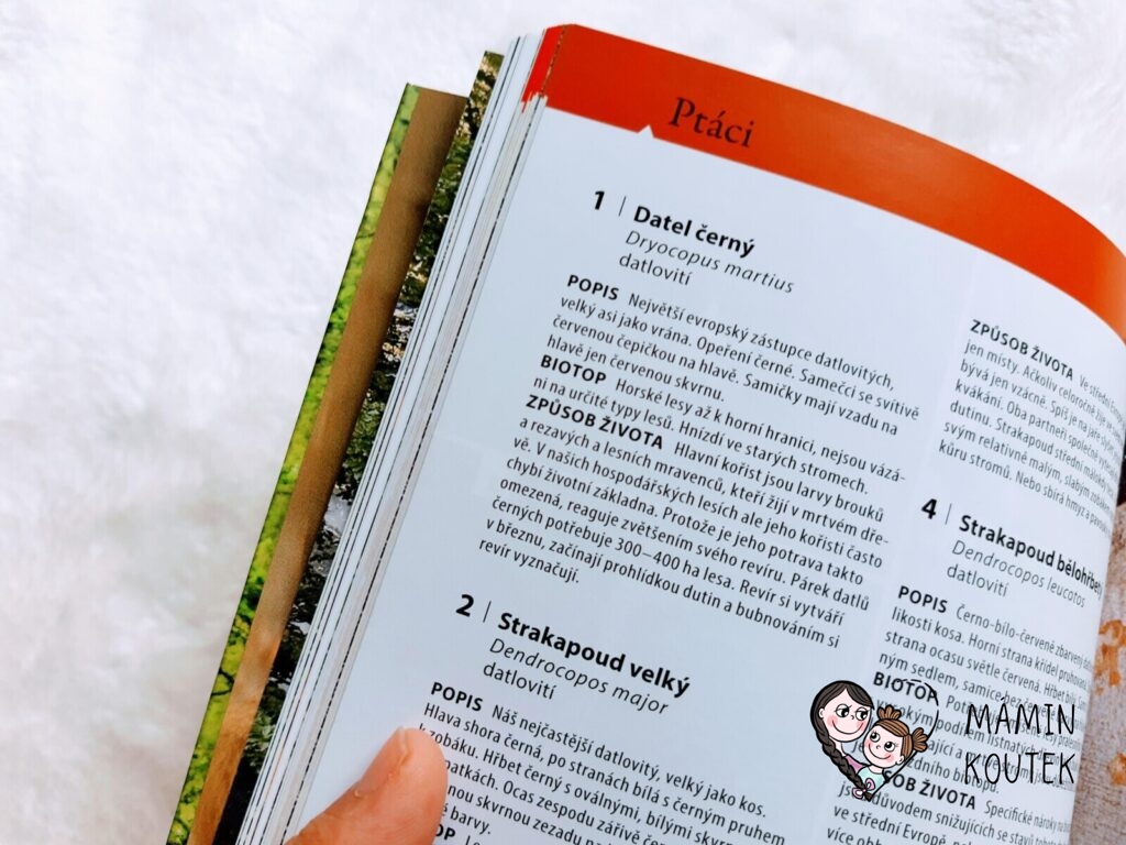Jediné, co mi na knize trošku vadilo, bylo menší písmo, na které nejsem úplně zvyklá. Ale na krátké vyhledání rostlin či zvířat to naštěstí tolik nevadilo. Kdyby bylo písmo větší, byla by kniha rozsáhlejší, což už by pak ztratilo původní smysl – mít malého pomocníka, kterého vezmete všude se sebou a můžete si rychle vyhledat, co máte zrovna před sebou.