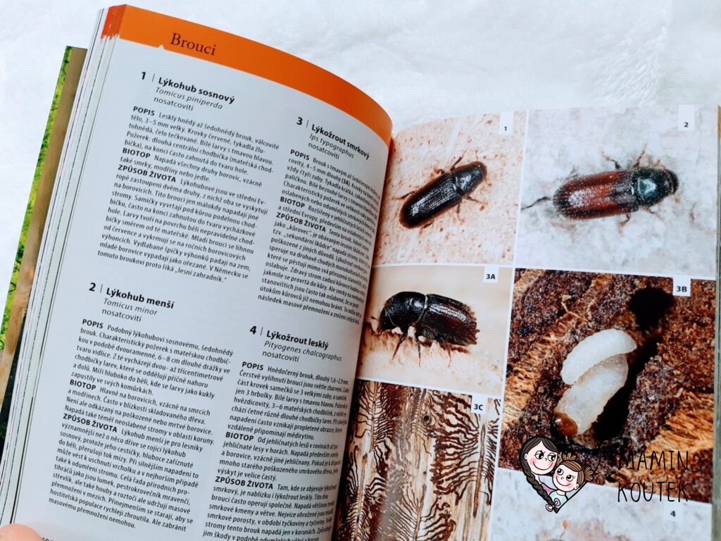 Kniha Velký průvodce lesem není určena primárně dětem, ale s dětmi ji určitě využijete. Obzvláště v nadcházejícím období léta a podzimu. Kniha obsahuje spoustu druhů rostlin a živočichů, se kterými se můžeme setkat v našich končinách, takže záběr má poměrně široký. A skvěle se hodí pro všechny, kdo nemají stromy či zvířata zrovna v malíčku, protože si mohou snadno vyhledat, s čím se zrovna setkali.