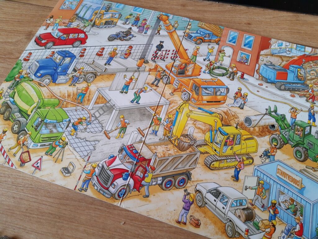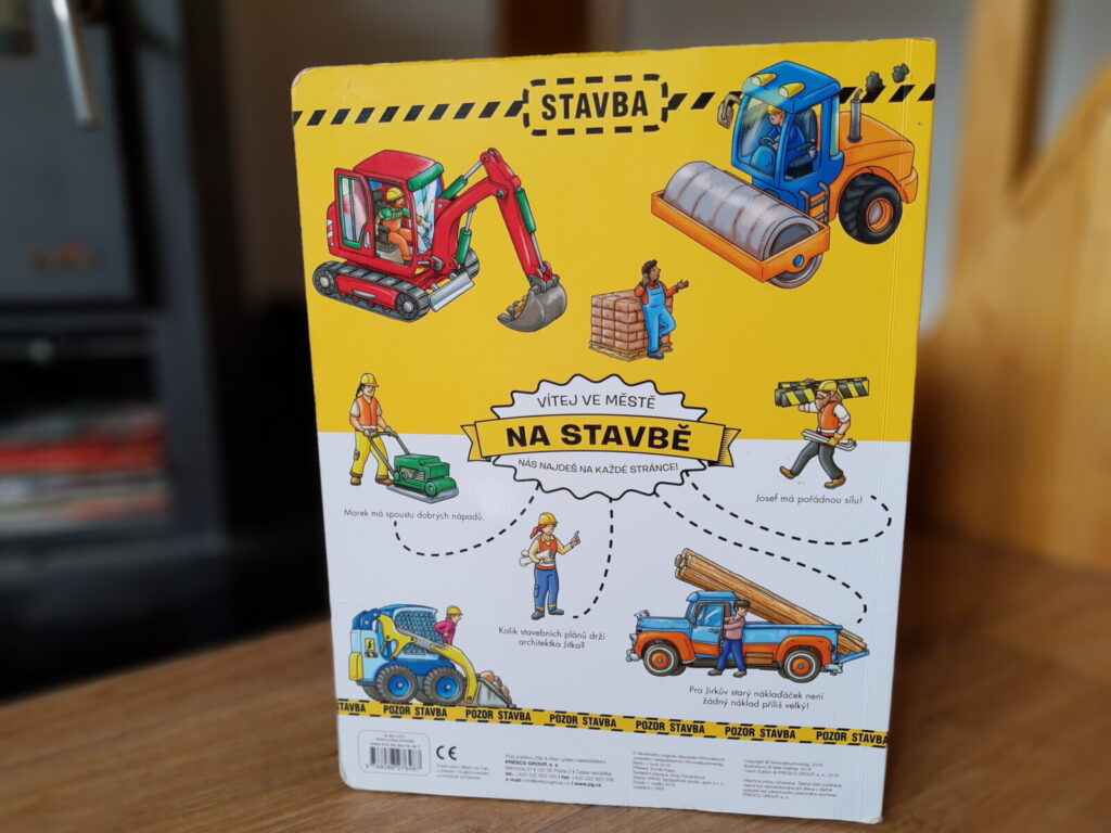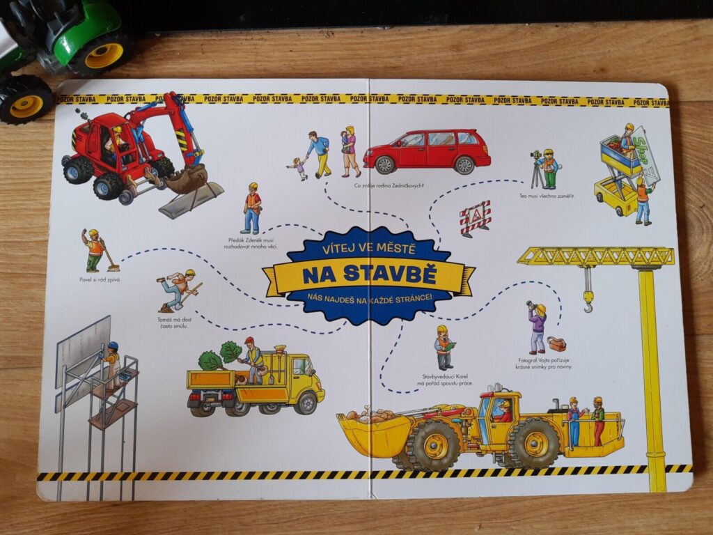 Motivem knížky je stavba, takže se děti setkají s různými pracovními stroji. U nás bylo při čtení s holkami škoda, že se v tomto tématu moc nevyznám a neuměla jsem hned všechny profese a auta pojmenovat. Ale vymysleli jsme si alespoň vlastní vyprávění. Kniha je vhodná pro děti od 3 let.