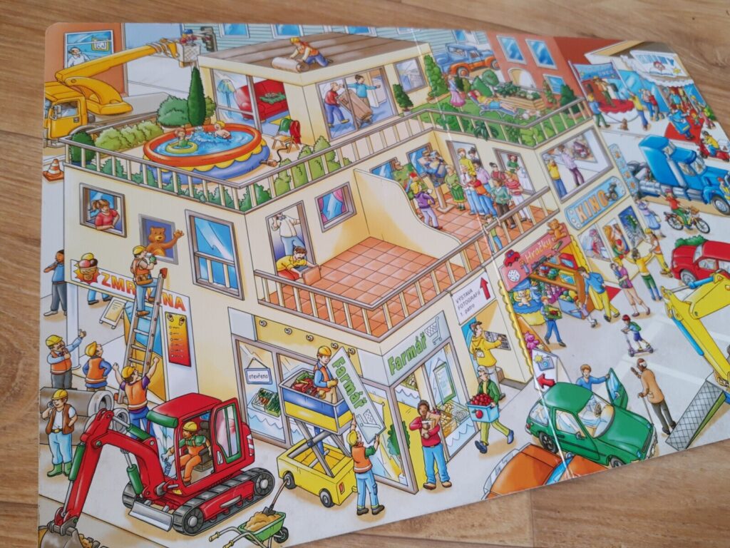 Na úvodní dvojstránce jsou vyobrazeny postavy a stroje, které by měly dětí najít na každé následující stránce. Seznámí se tak se stavbyvedoucím Karlem, meřičem Teem, předákem Zdeňkem nebo třeba rodinou Zedníčkových.