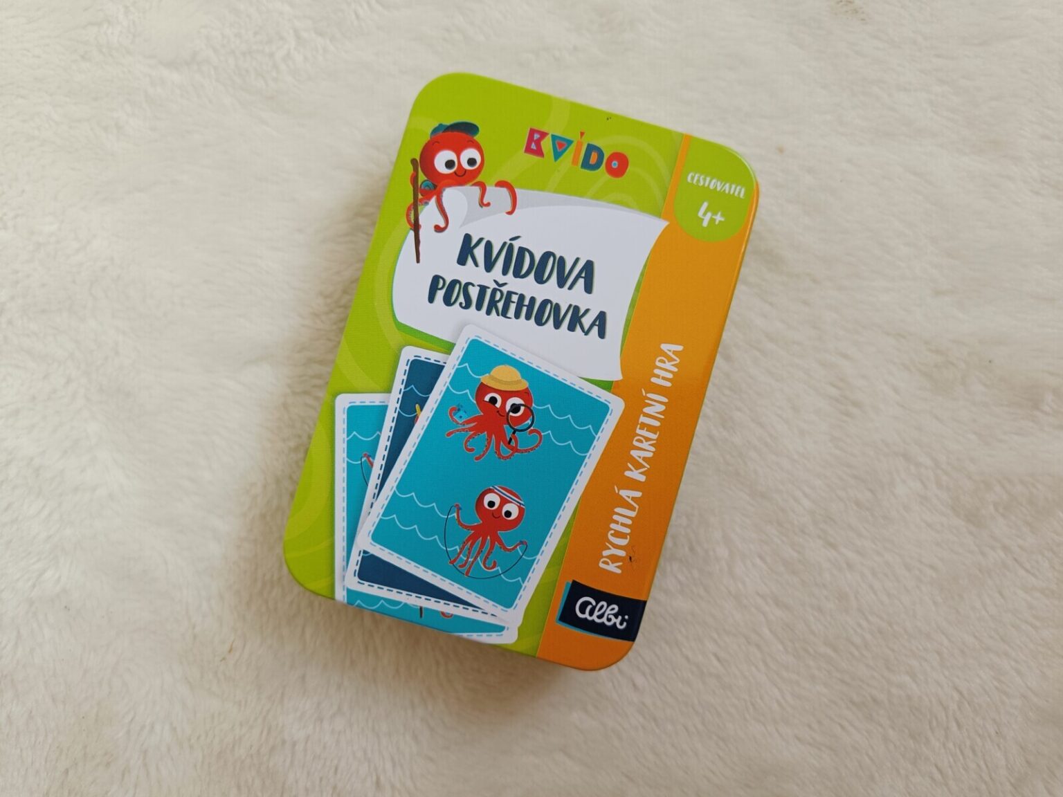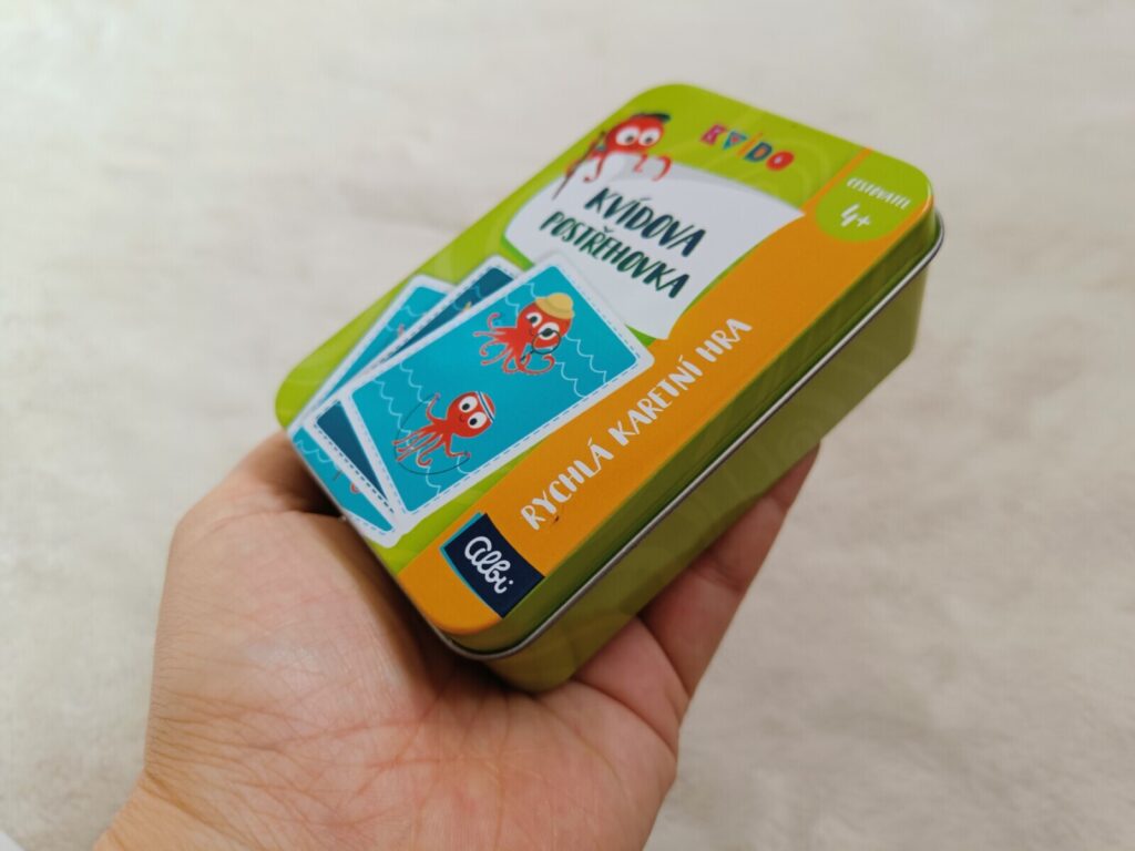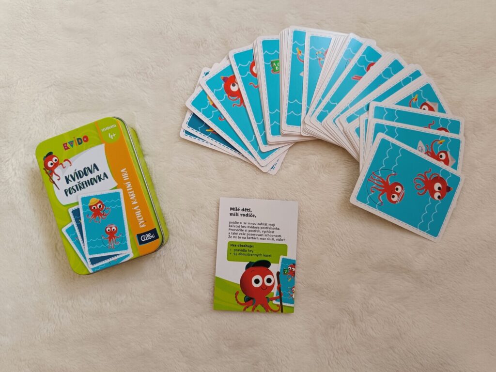 Kvídova postřehovka je rychlá, svižná a jednoduchá hra, ve které se snažíte najít co nejvíce stejných chobotniček. Líbí se mi hlavně ta poslední vlastnost. Hra nemá složitá pravidla a snadno ji tak můžete na cestách hrát i s lidmi, kteří ji neznají. Prostě když je chvilka času, stačí někde sednout, vytáhnout karty a můžete hrát. Najít stejnou chobotničku, to je hlavně o postřehu, rychlosti a pozornosti. Takže se může zapojit kdokoliv.
