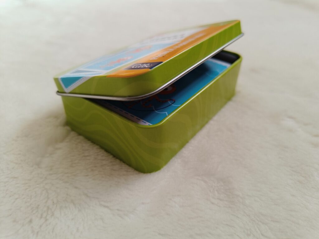 Dále kladně hodnotím kovovou krabičku. Přeci jen když je hra určena na cestování, je velká pravděpodobnost, že obal bude vystaven náročnějším podmínkám. Kovová krabička ale dobře drží a dokonce ani nevadilo, když se nám v batůžku vylilo trochu pití. Takže zpracování povedené a vřele doporučuji nejen na cesty (my hrajeme i doma).