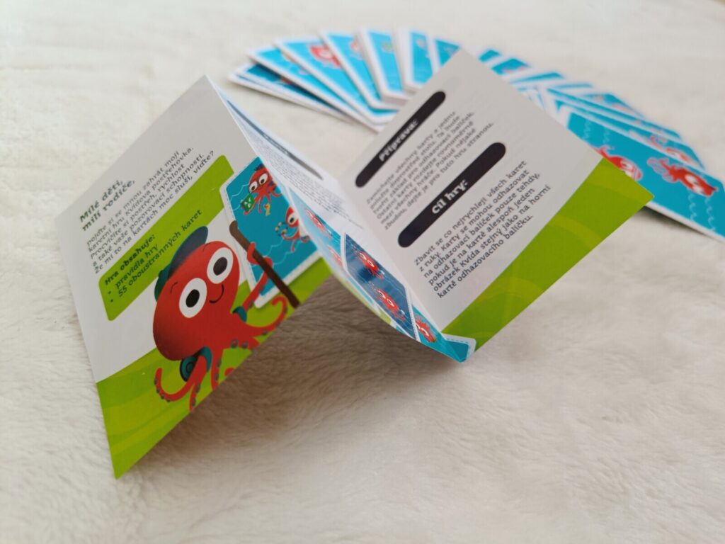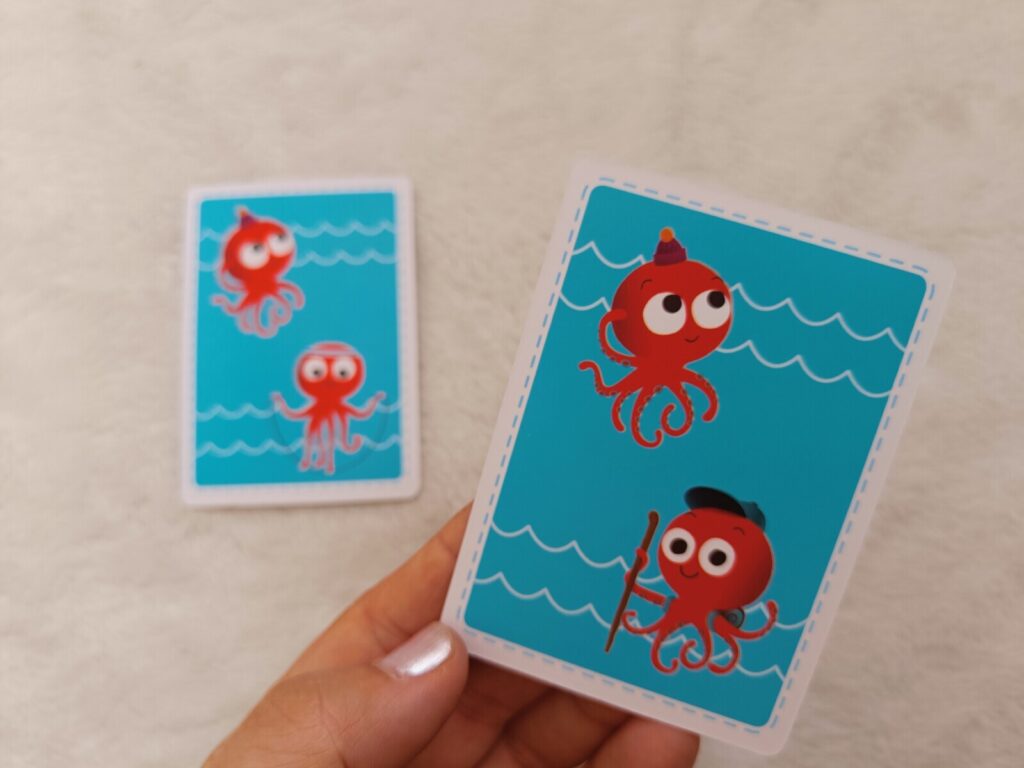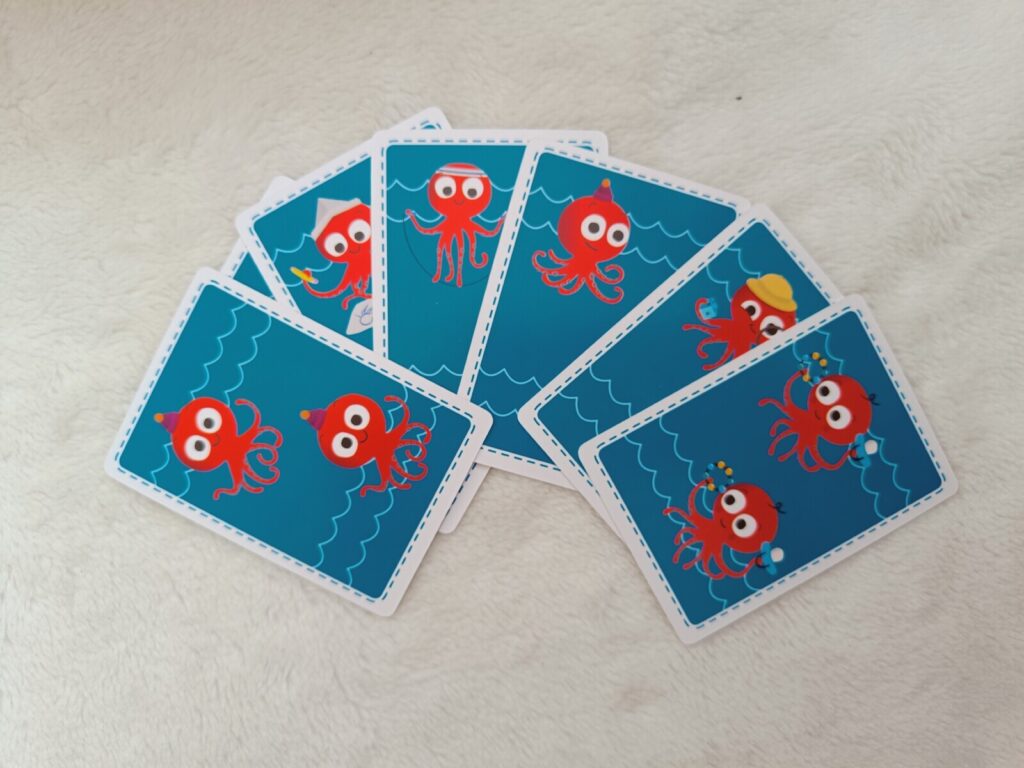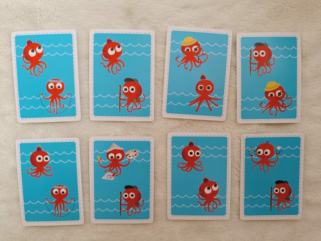 Karty se světlě modrým podkladem mají dvě chobotničky, které jsou vždy od sebe odlišné. Speciální karty s tmavě modrým pozadí mají obě chobotničky stejné. Pokud karty otočíte, najdete na druhé straně jiné obrázky, ale stále na stejném principu.