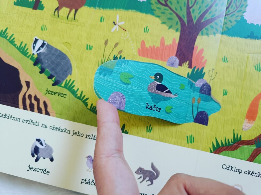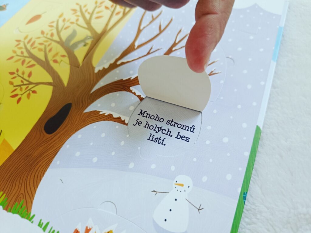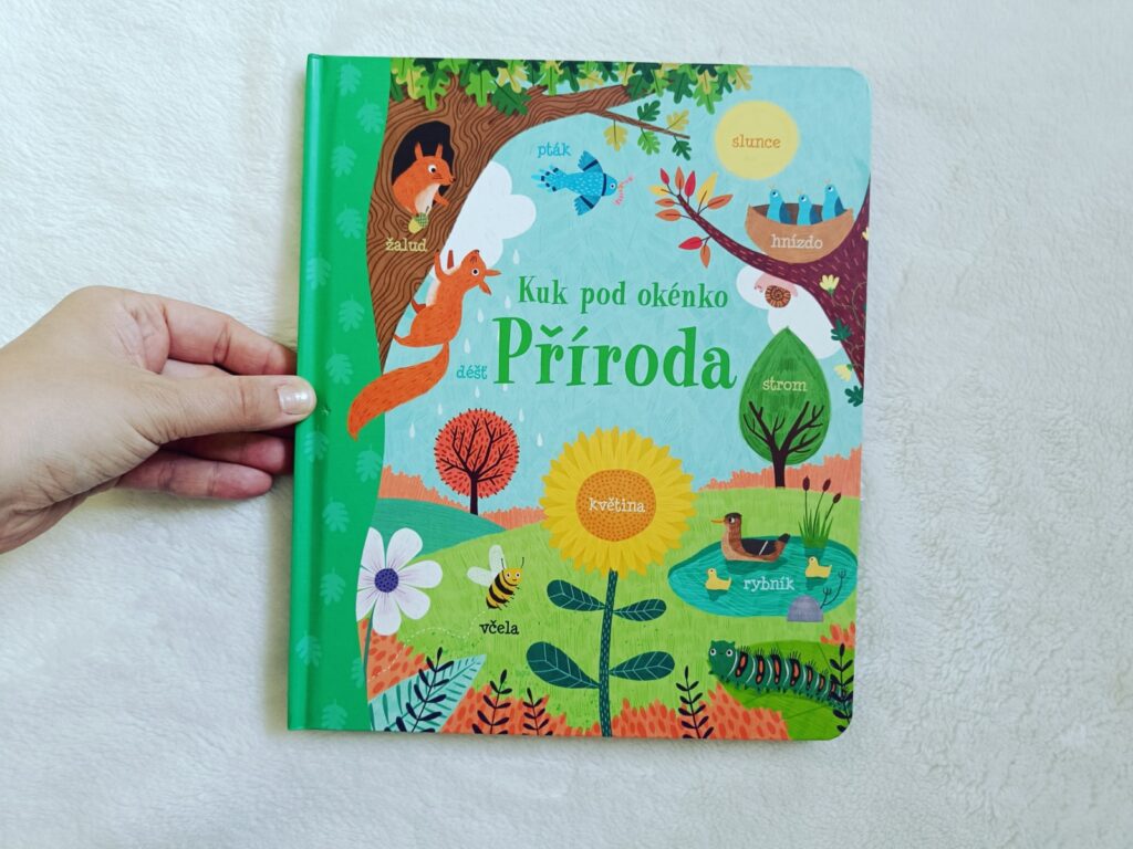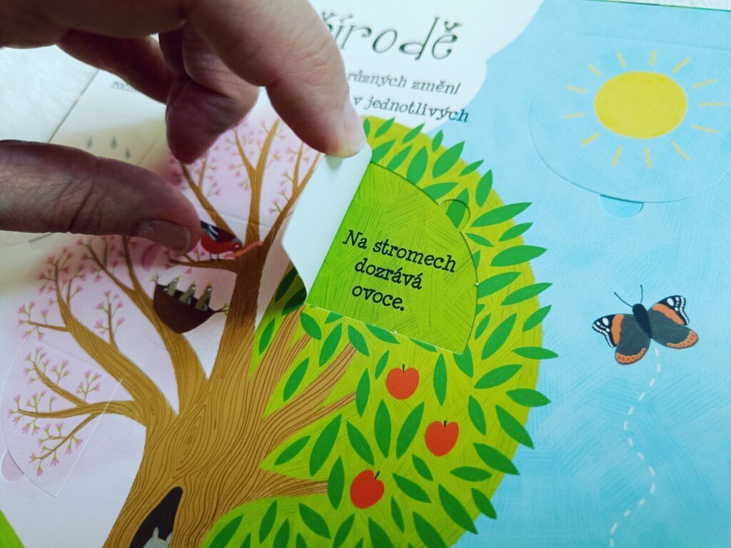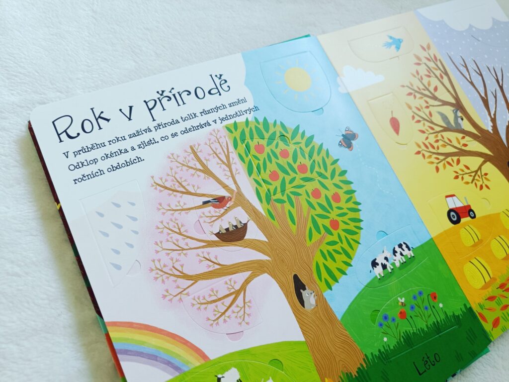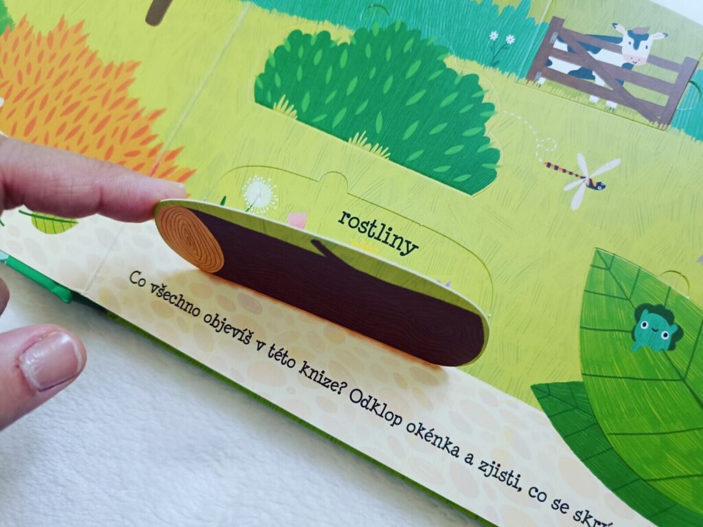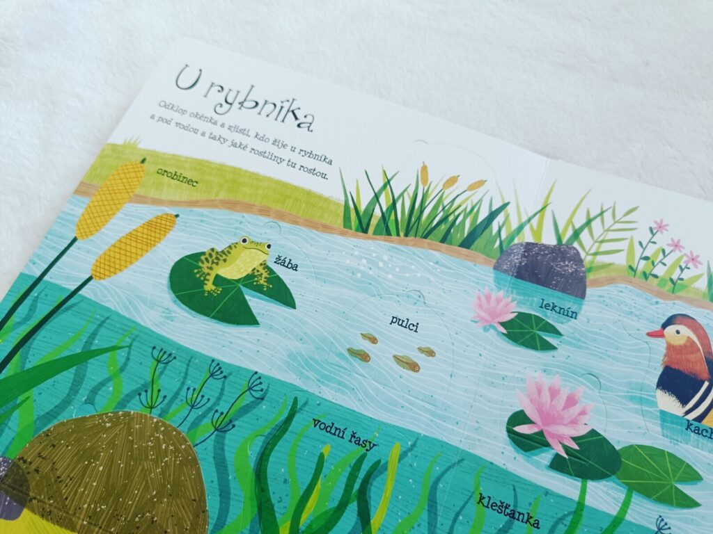 Hned na úvod děti pomocí okének zjistí, co je v knize vlastně čeká – počasí, stromy, zvířata, ptáci, rostliny, život u rybníka nebo třeba drobní živočichové.