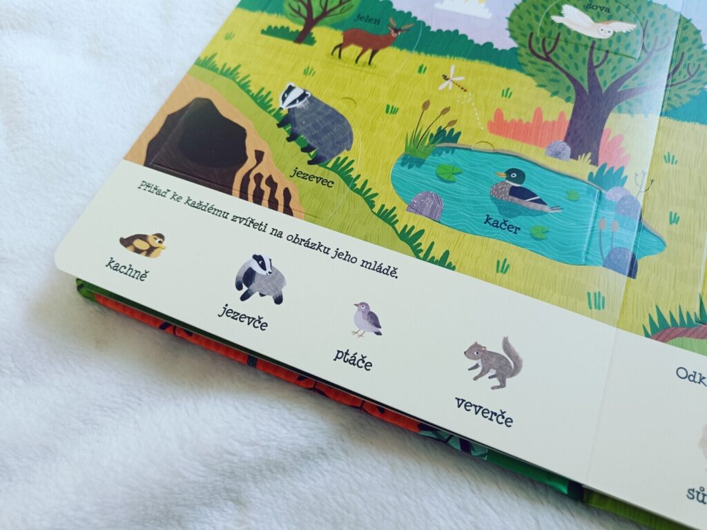 Zajímavým tématem jsou Mláďata. Na dvojstránce najdete různá zvířata a pokud otevřete okénko, najdete pod ním obrázek zvířete a jeho mláděte. Děti si pak mohou procvičit získané znalosi tím, že budou přirazovat, které mládě patří kterému zvířeti.