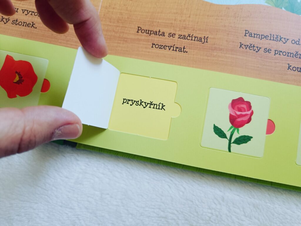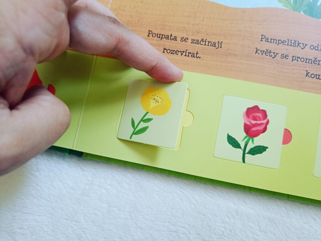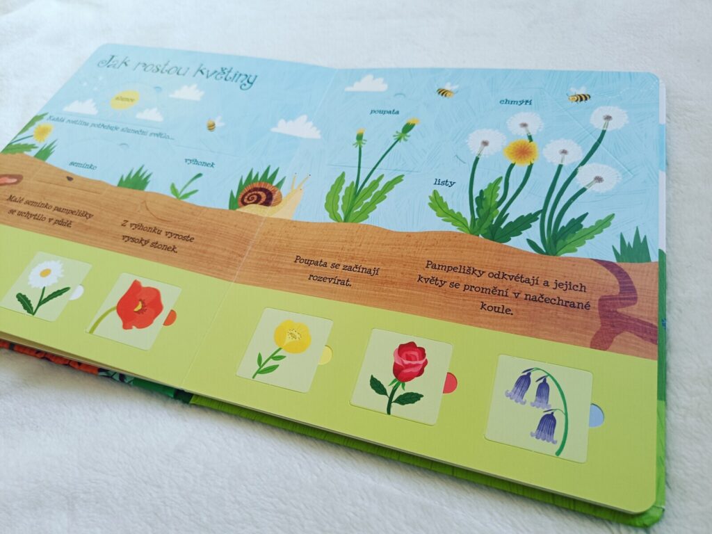 Příroda není jen o zvířatech, a proto nechybí například kapitola Jak rostou květiny. Děti zjistí, že každá rostlinka potřebuje slunce, ale také déšť (resp. vodu). A poté mohou zkoumat, jak roste pampeliška – ze semínka, přes výhonek a poupata, až po krásnou pamelišku či chmýří. Naučí se také poznávat kopretinu, vlčí mák, pryskyřník a další rostliny.