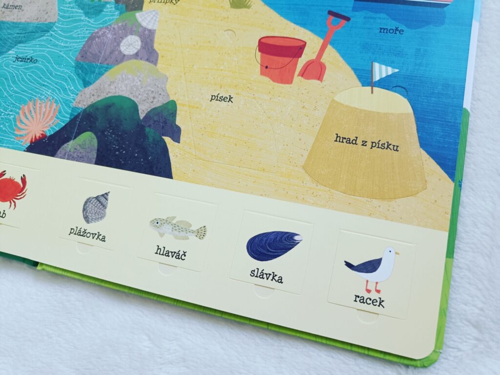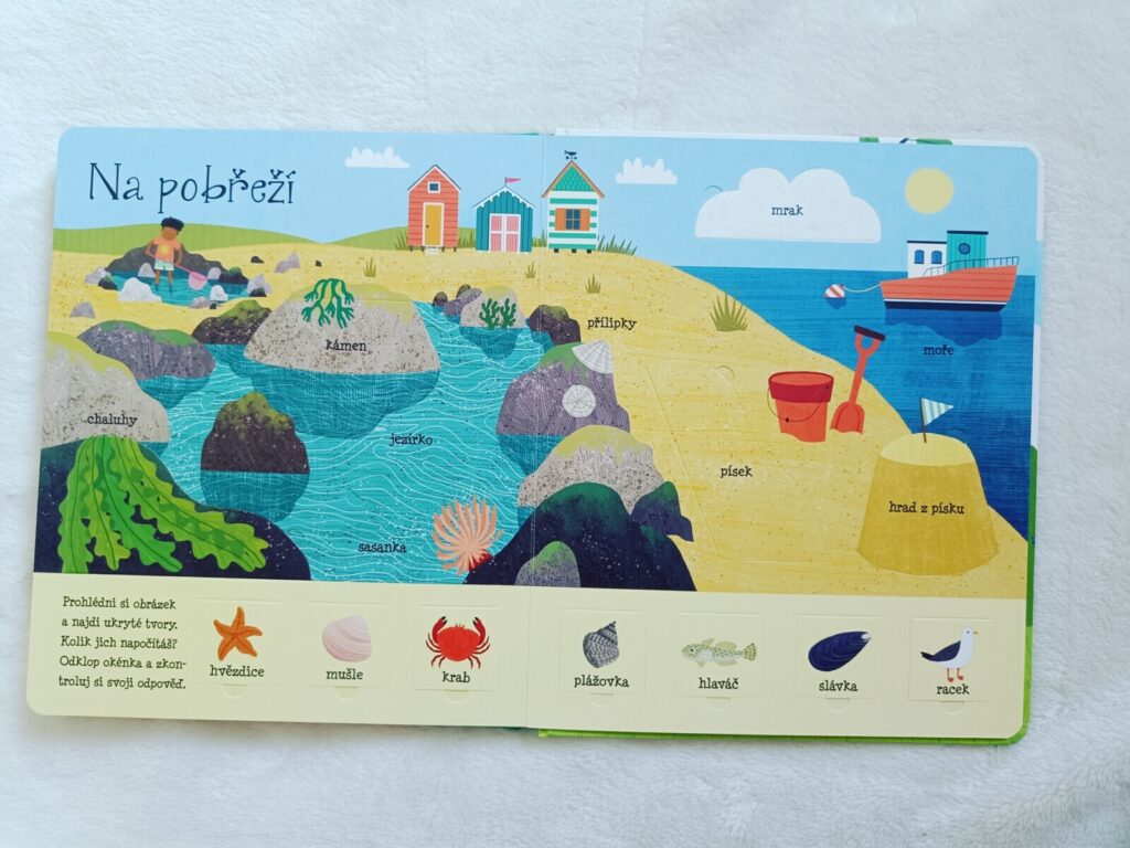 Trochu netradiční je pak příroda na pobřeží. Zde najdeme například hvězdice, mušle, kraba, plážovku, slávku či racka. A úkolem dětí je najít, kde tito živočichové žijí (např. v písku, v moři, v jezírku, pod kamenem a jiné).