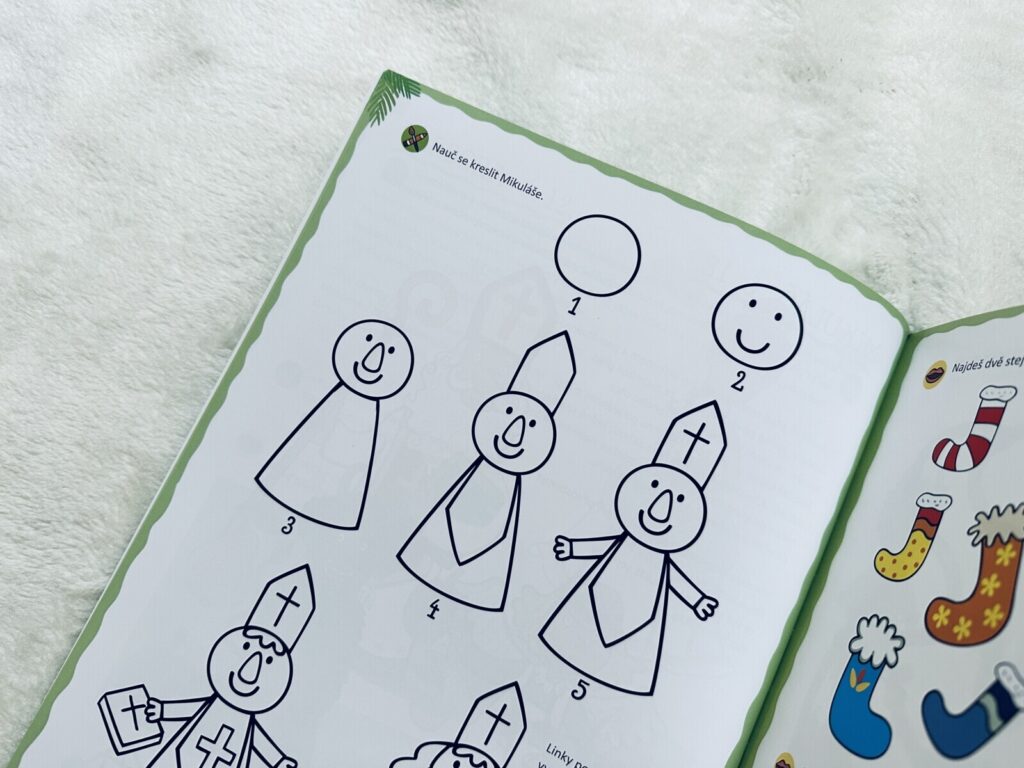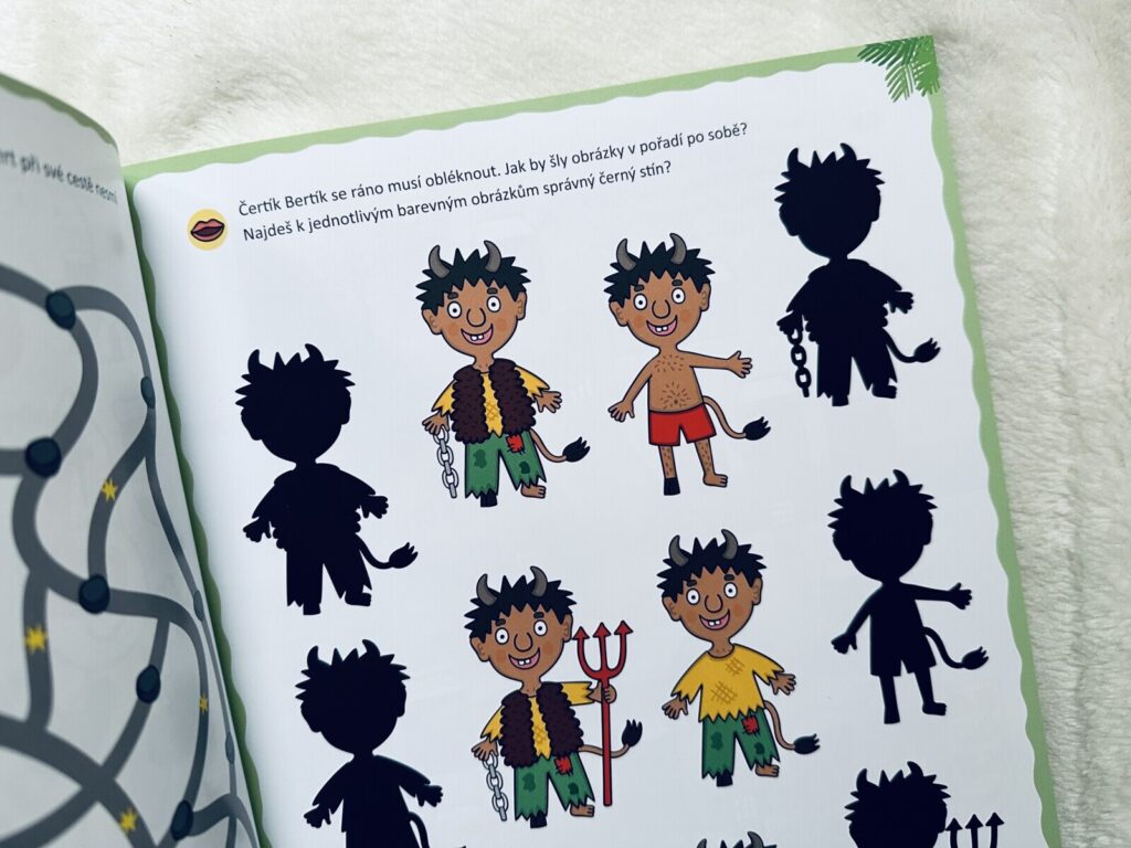 Dále na čtenáře čeká bludiště, hledání čertů podle stínů a nechybí ani informace o sv. Mikuláši. Toho si dokonce mohou děti zkusit nakreslit dle předepsaného postupu.