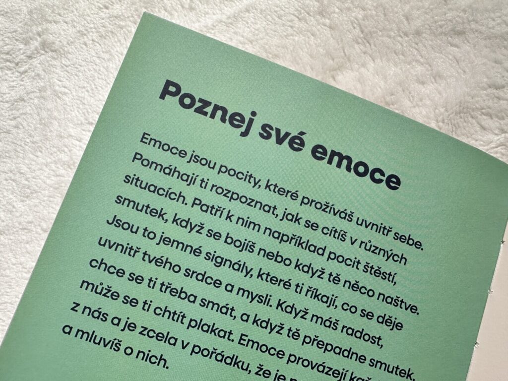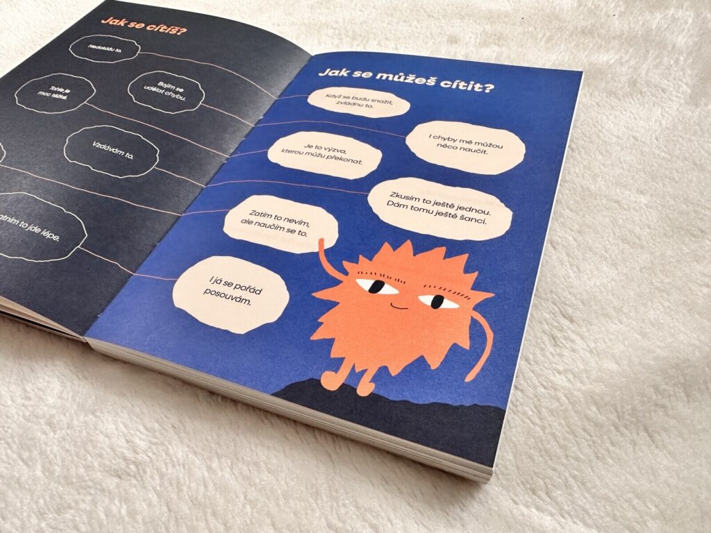 Jsou zde také stránky zaměřené na uvědomění si, co má dítě rádo a co mu přináší krásné pocity. Ale i co ho může trápit a jak z toho ven. Nebo že je v pohodě, když někoho poprosíme o pomoc, svěříme se, nebo třeba nevíme vše.