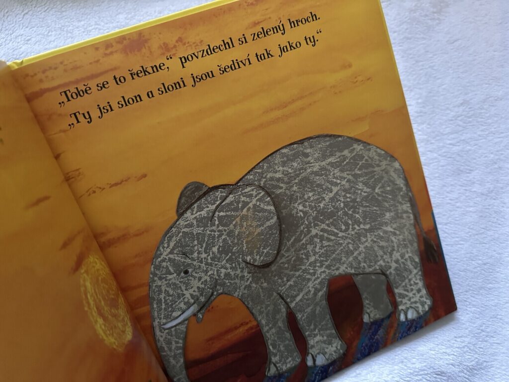 Když zvedl hlavu, všiml si ptáků. I ti měli každý jiné zbarvení. Navíc každý zpíval jinou písničku. A přesto byli úžasní. A tak se mu hned spravila nálada a s nadšením běžel za svými kamarády – slonem, žirafou a žábou.